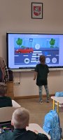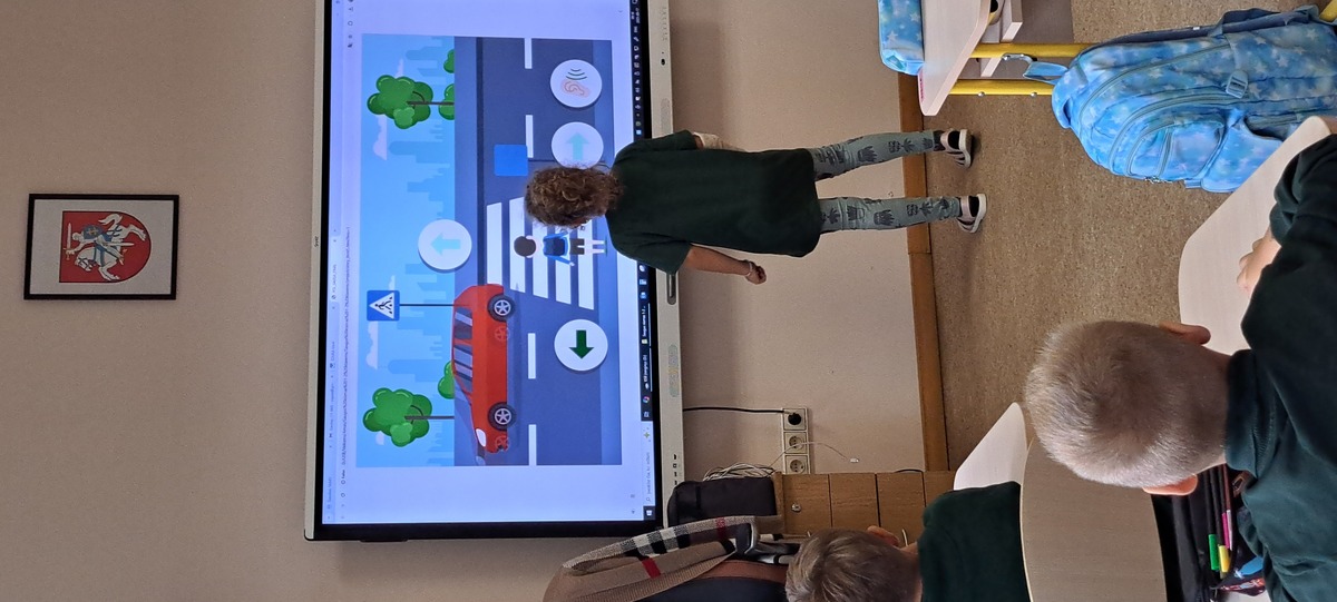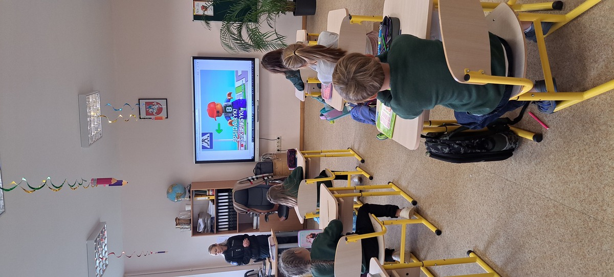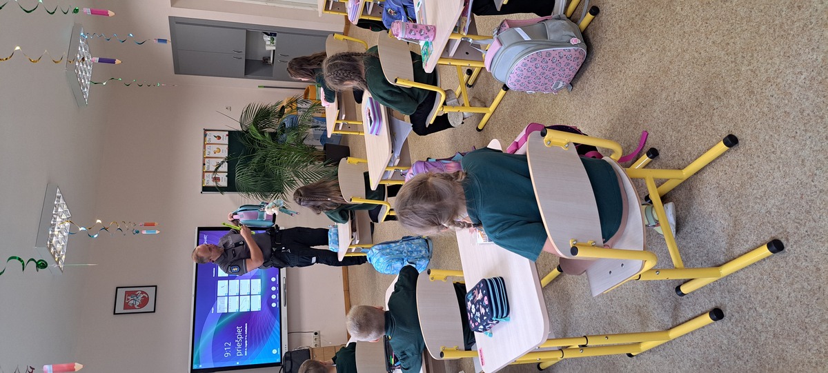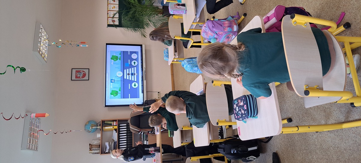 Rugsėjo 17 dieną mokykloje lankėsi bendruomenės pareigūnai Linas ir Ilona, kurie pirmokams vedė saugaus eismo pamoką. Mokiniai prisiminė, kaip saugiai pereiti gatvę, kodėl svarbu turėti atšvaitą ir kaip jį tinkamai segėti. Pareigūnai vaikus supažindino su pėsčiųjų pareigomis, paaiškino, kodėl būtina automobilyje prisisegti saugos diržus. Atlikdami interaktyvius testus pirmokėliai gilino saugaus eismo žinias.