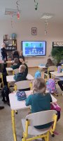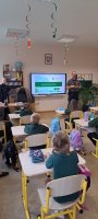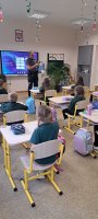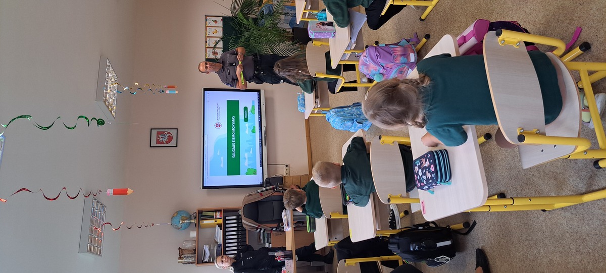 Rugsėjo 17 dieną mokykloje lankėsi bendruomenės pareigūnai Linas ir Ilona, kurie pirmokams vedė saugaus eismo pamoką. Mokiniai prisiminė, kaip saugiai pereiti gatvę, kodėl svarbu turėti atšvaitą ir kaip jį tinkamai segėti. Pareigūnai vaikus supažindino su pėsčiųjų pareigomis, paaiškino, kodėl būtina automobilyje prisisegti saugos diržus. Atlikdami interaktyvius testus pirmokėliai gilino saugaus eismo žinias.